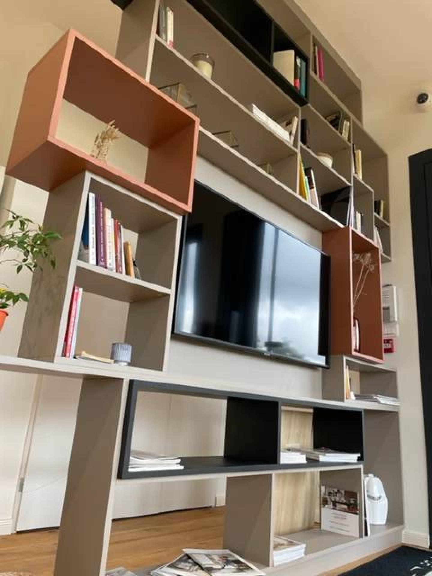 Une bibliothèque tri-color vertigineuse (3 mètres de haut, tout de même !) vous donnera un aperçu de ce qu'on peut faire en sur-mesure, du sol au plafond.